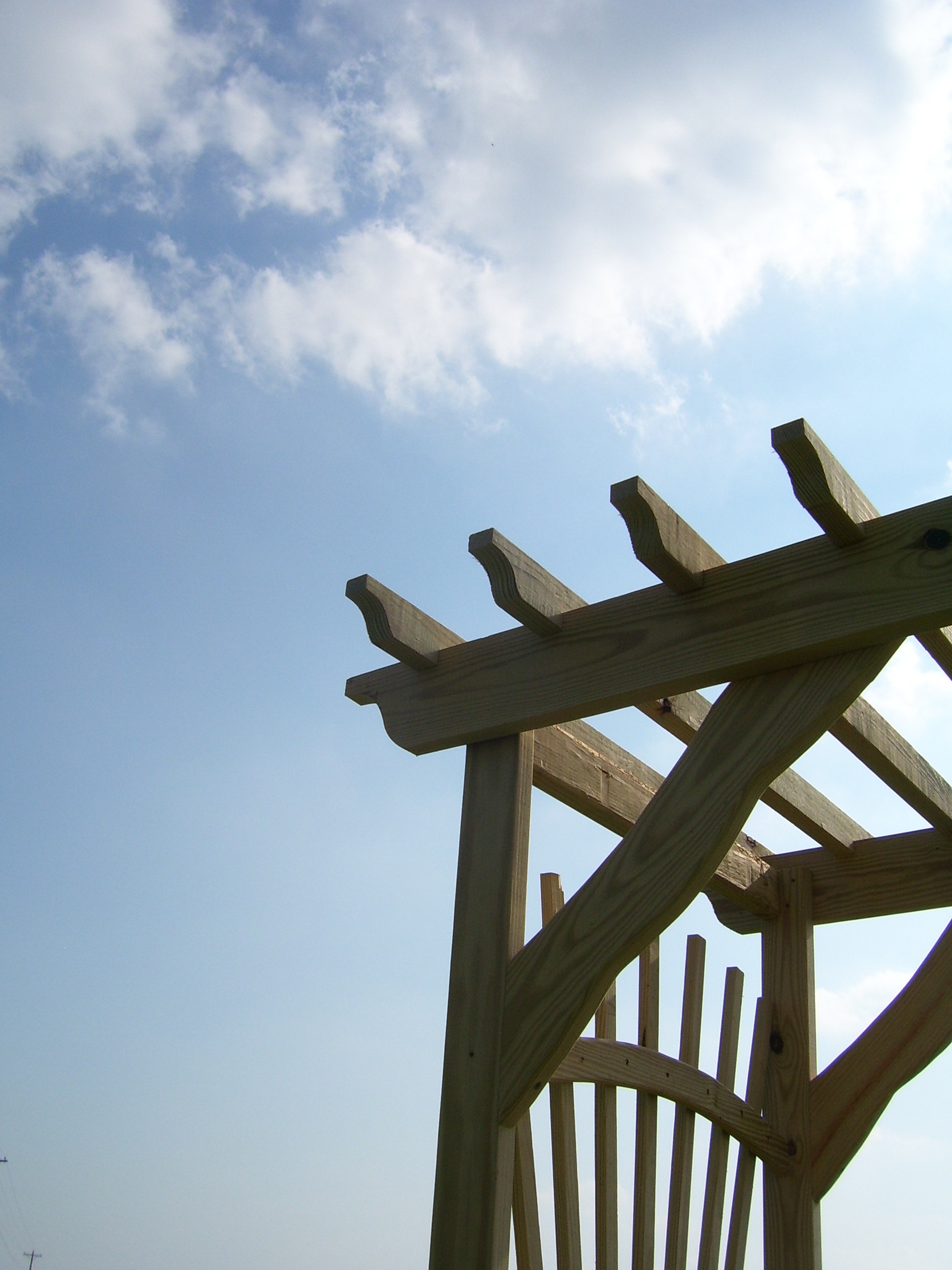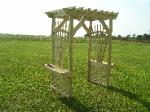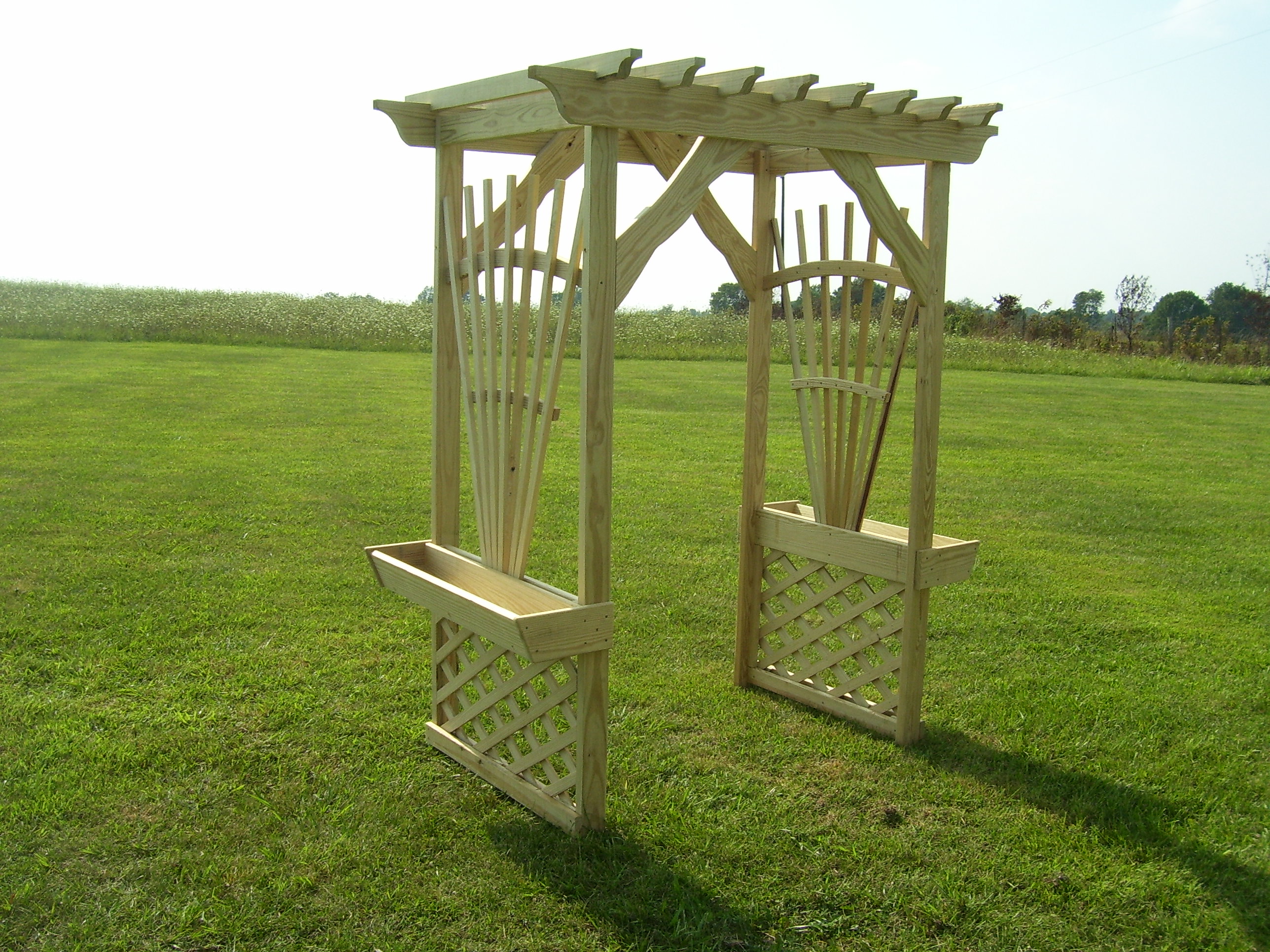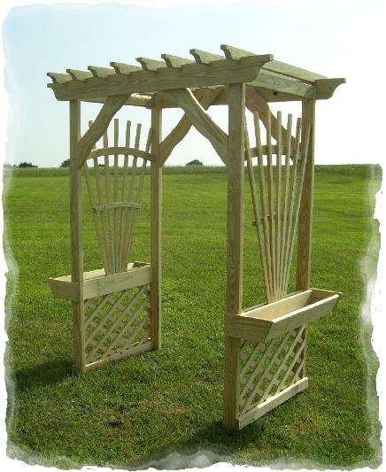 The Sunburst series of arbors, featuring a vibrant design, would be welcome in any backyard. The arbor is made of #1 grade "Smart Sense" brand, pressure treated lumber. The lighter color lends itself to beautiful rich tones if stained. It features flower boxes on each side. All screws and bolts are coated for use with pressure treated lumber. All edges are routered for safety and comfort.
