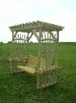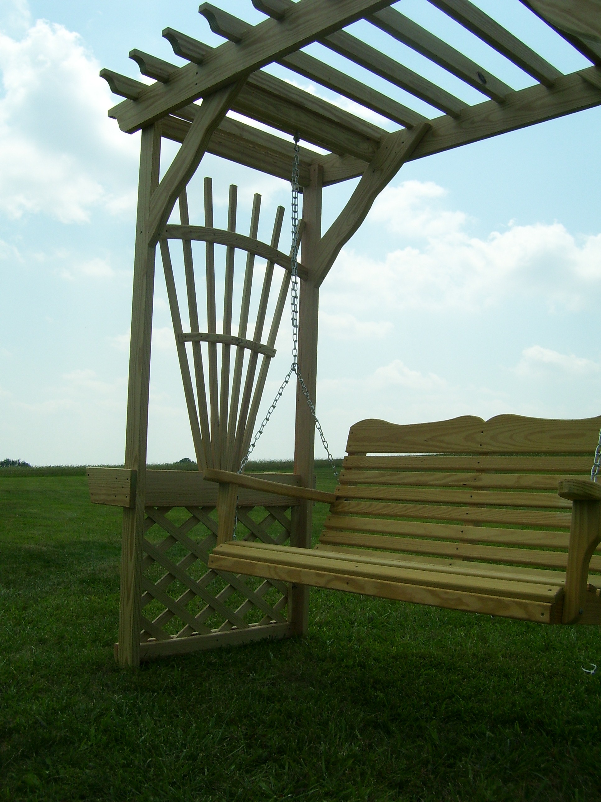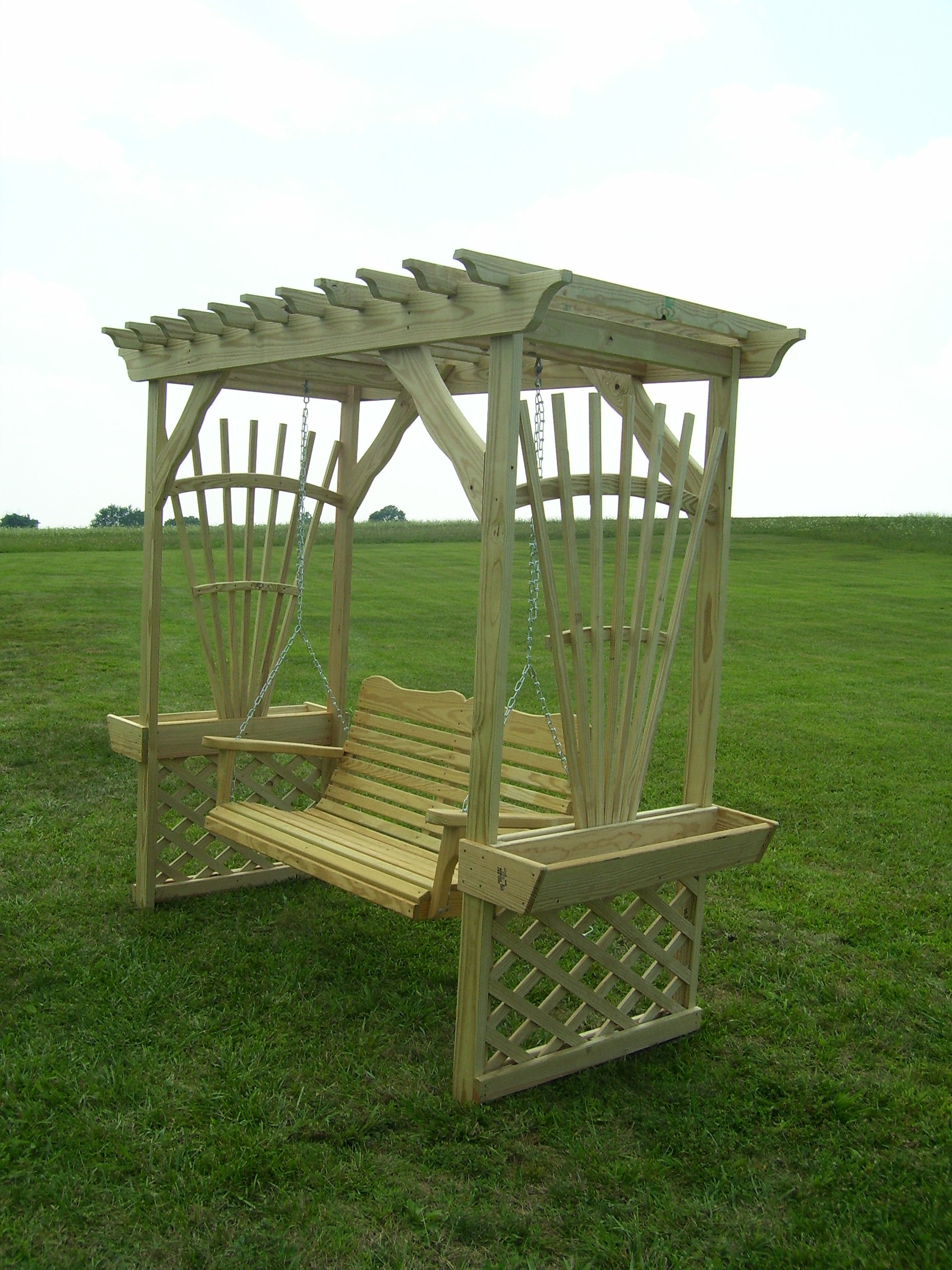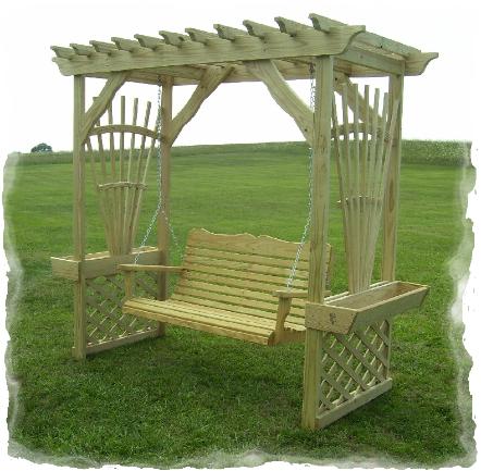 The Sunburst series of arbors, featuring a vibrant design, would be welcome in any backyard. The arbor is made of #1 grade "Smart Sense" brand, pressure treated lumber. The lighter color lends itself to beautiful rich tones if stained. It features flower boxes on each side. The Swing arbor features a swing joists and hooks for mounting a hanging swing. All screws and bolts are coated for use with pressure treated lumber. All edges are routered for safety and comfort.